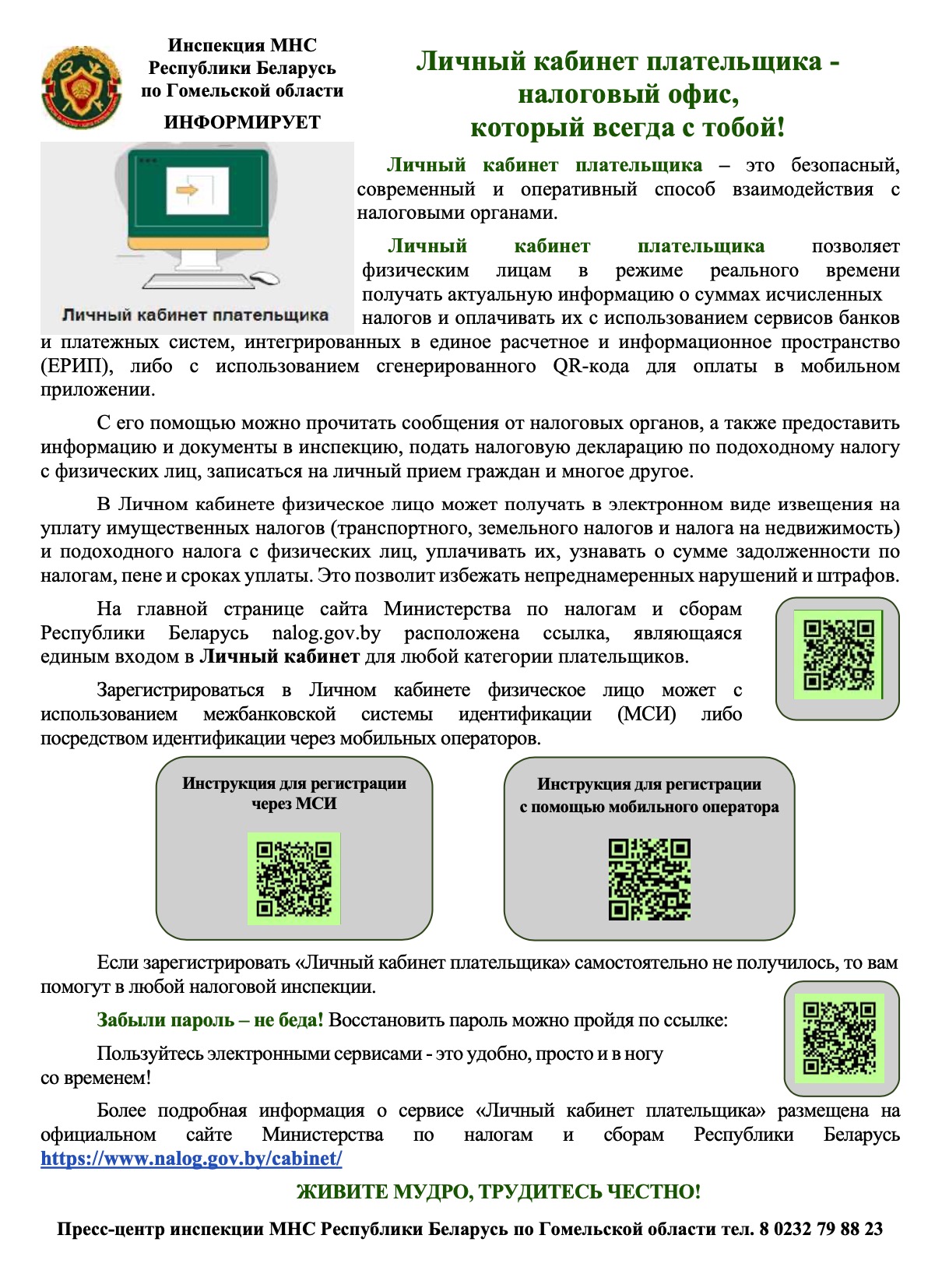 Инспекция Министерства по налогам и сборам Республики Беларусь по Центральному району г. Гомеля информирует, что электронные обращения направляются только посредством государственной единой (интегрированной) республиканской информационной системы учета и обработки обращений граждан и юридических лиц – обращения.бел. Электронные обращения, полученные на электронный адрес налогового органа, не рассматриваются.